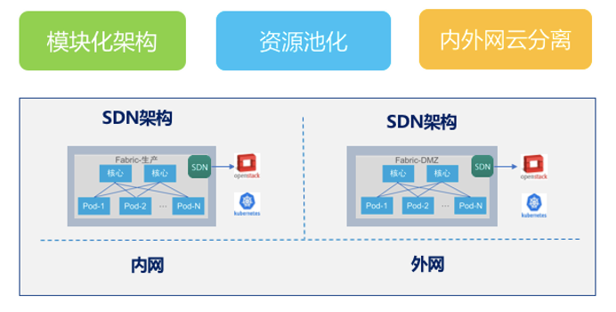 云数据中心部署网络、SDN控制器、云平台、虚机管理平台(可集成于云平台),通过控制器与云平台和虚机管理平台对接的方式,实现云网协同。实现云平台统一管理计算、存储和网络资源。在云网协同的场景下,云数据中心通常采用水平分区、垂直分层的设计思路,并根据金融数据中心对业务应用安全性的要求(业务应用划分为内网业务和外网业务),将数据中心划分为内网资源池和外网资源池。