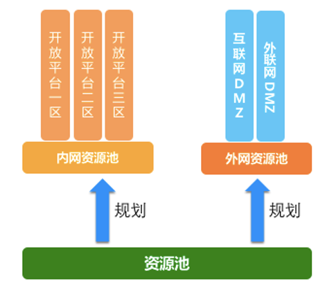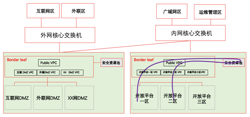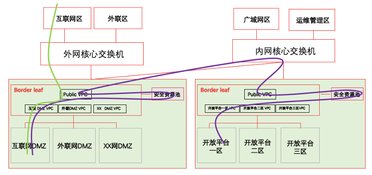 如果进一步细分到资源池VPC的路径为(以互联网区为例):从互联网区→ Public VPC(外网资源池)→ 互联网DMZ VPC(外网资源池)→ Public VPC(外网资源池)→ 内网核心→Public VPC(内网资源池) →安全资源池(内网资源池)→ 开放平台业务区(内网资源池)