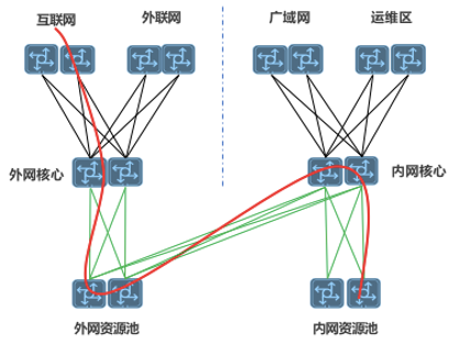 用户将依次经过外网核心、外网资源池、内网核心和内网资源池,实现业务访问。整体流量走向如下: