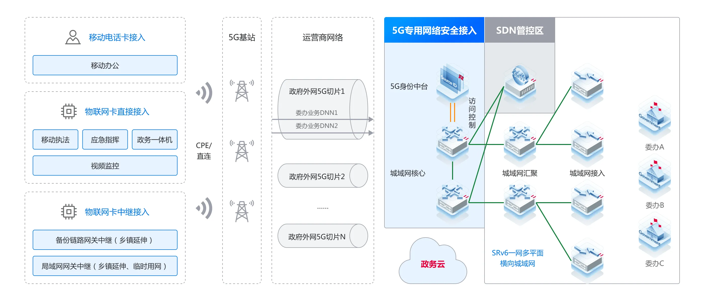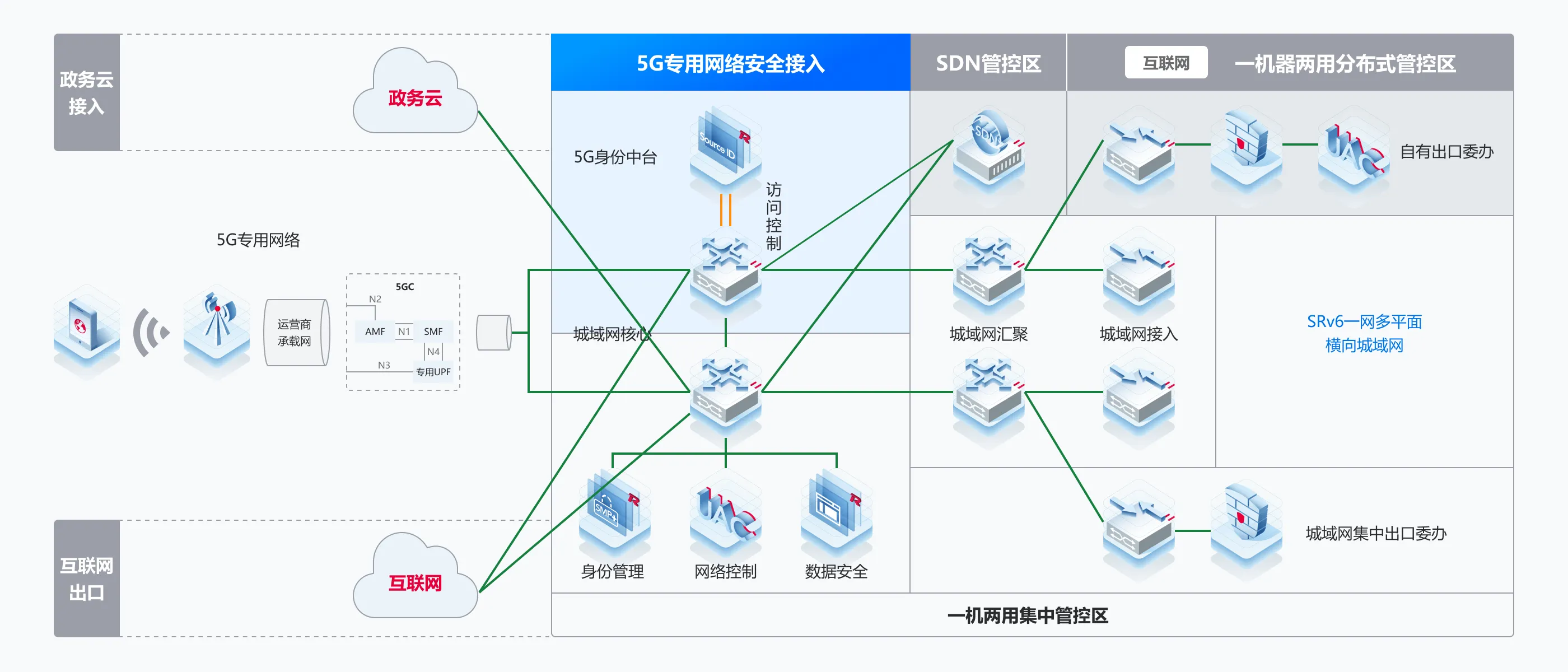 SRv6智能城域网结合5G专用网络安全接入的固移融合一张网,实现一网多平面、移动办公、物联网、应急&临时用网等各场景全域接入