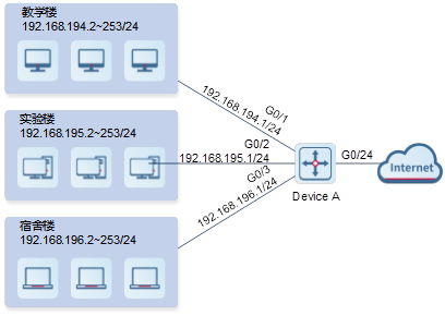 某学校通过Device AG0/24上联Internet,Device AG0/1、G0/2G0/3分别下联的教学楼(192.168.194.2~253/24)、实验楼(192.168.195.2~253/24)和宿舍楼(192.168.196.2~253/24)